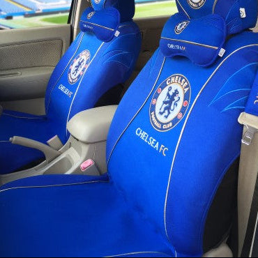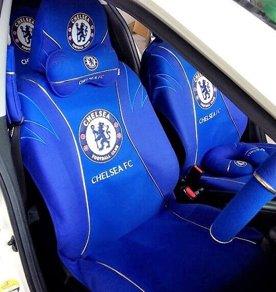 Blue car seat covers with Chelsea FC logo on a vehicle interior.